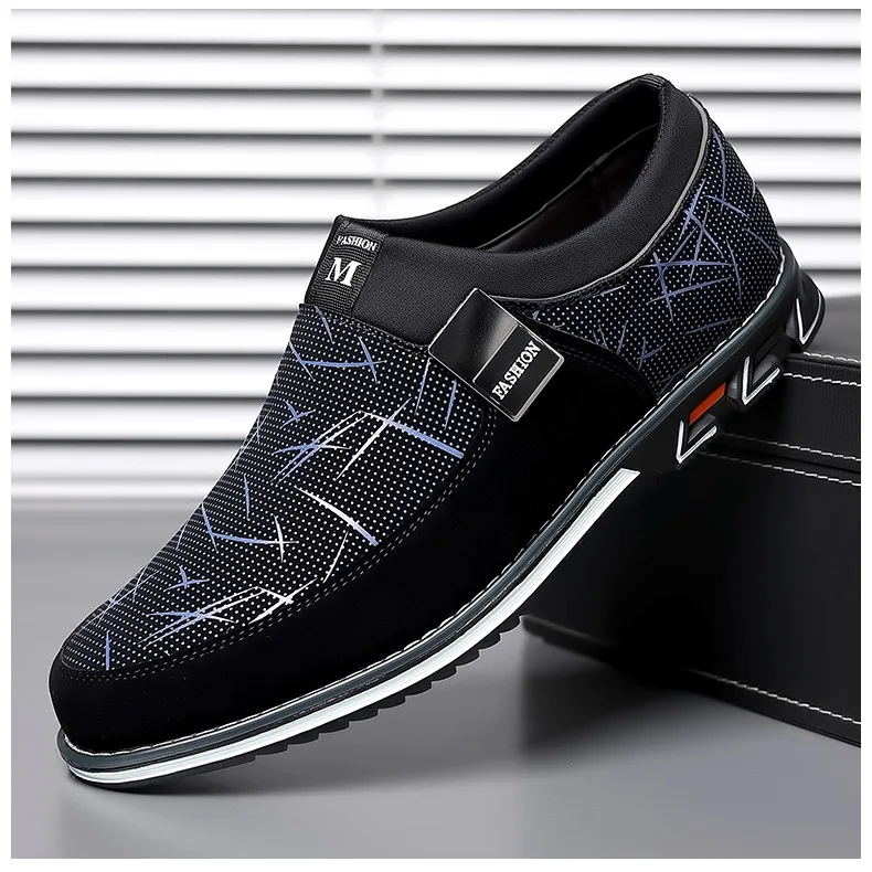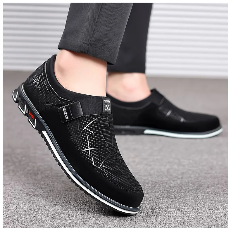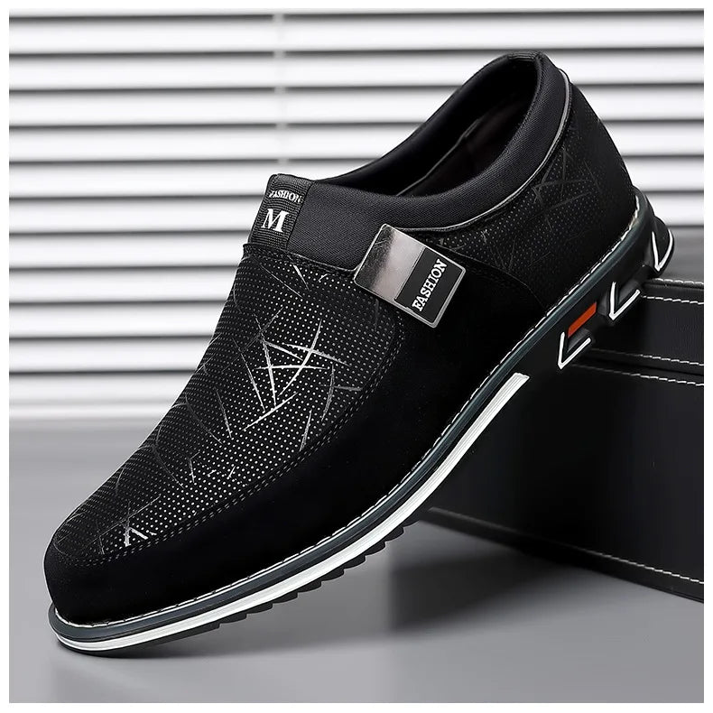 Dieser Herren-Slipper vereint Funktionalität und Stil in einem. Das moderne Design mit geometrischen Details verleiht Eleganz, während das atmungsaktive Material den ganzen Tag über leichten Tragekomfort gewährleistet.
