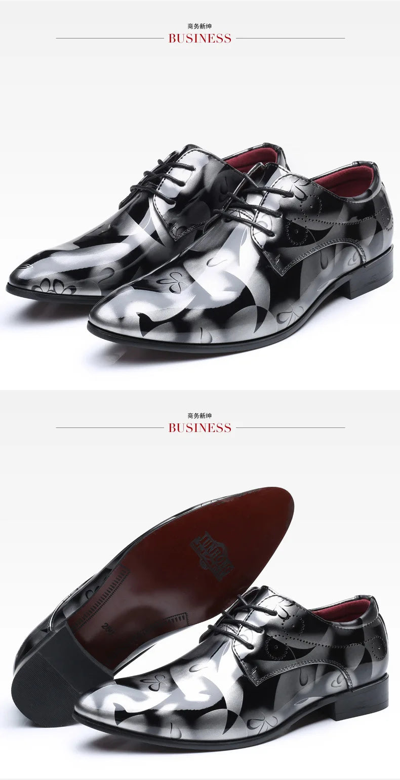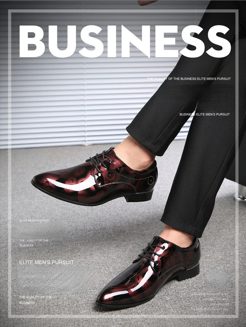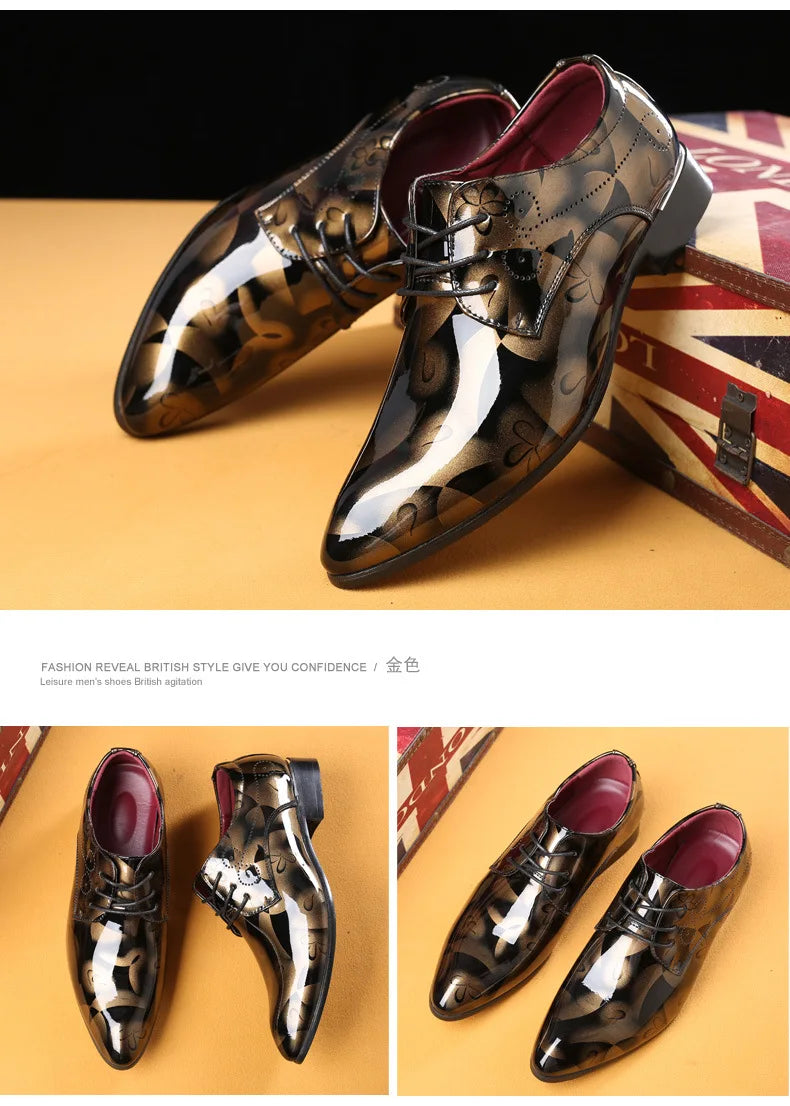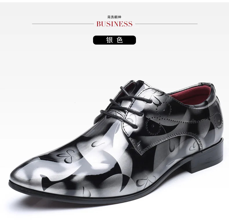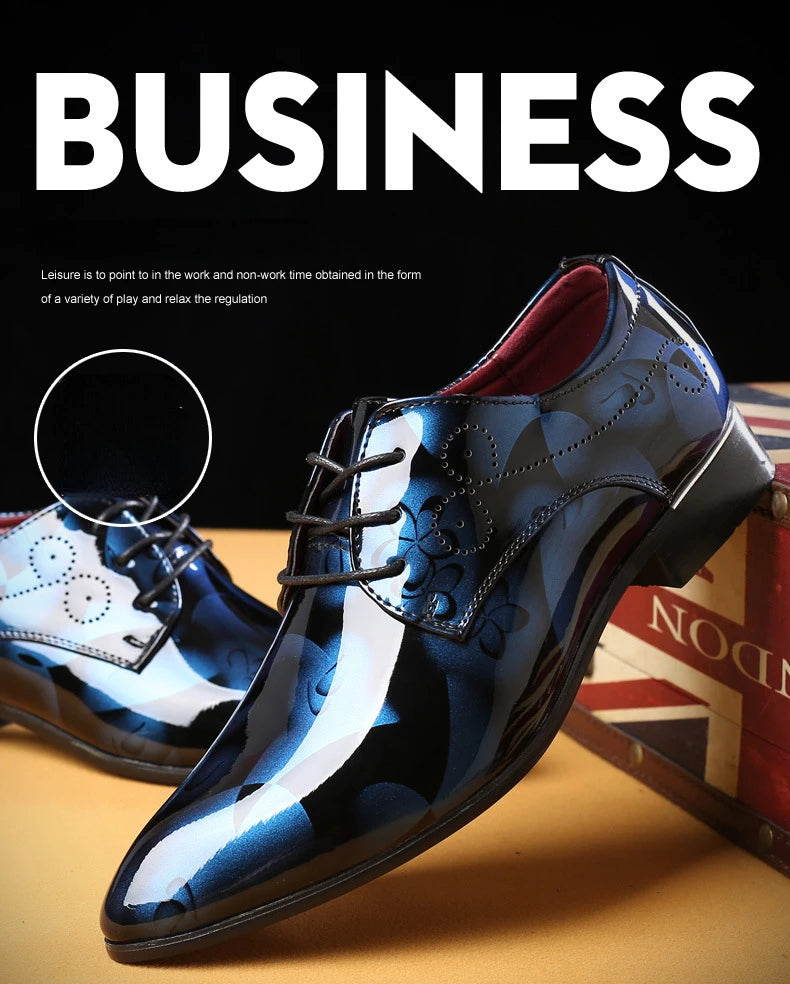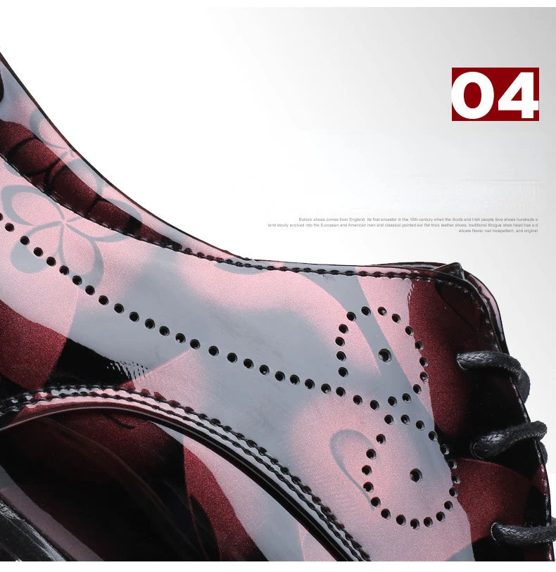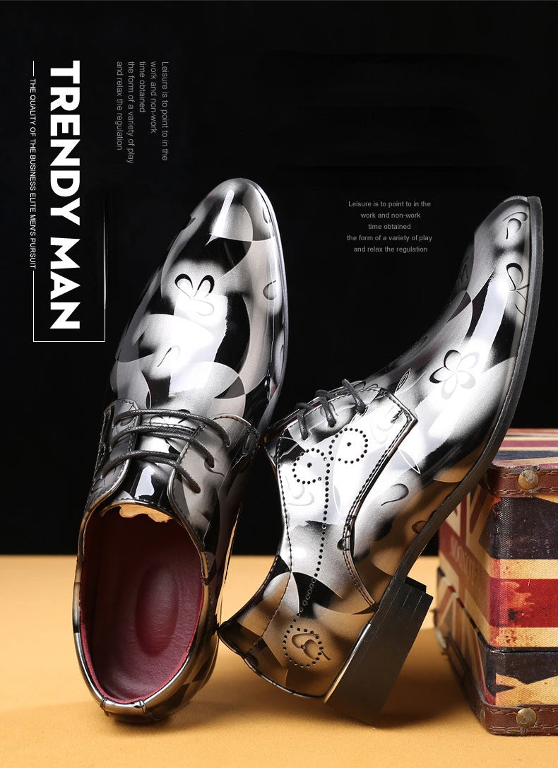 Diese Herrenschuhe aus Lackleder sind für alle gemacht, die mit Selbstvertrauen und Eleganz auffallen möchten. Mit ihrer glänzenden Oberfläche und dem auffälligen Druckdesign verleihen sie formeller Kleidung eine einzigartige Note.