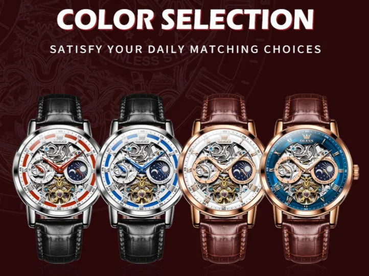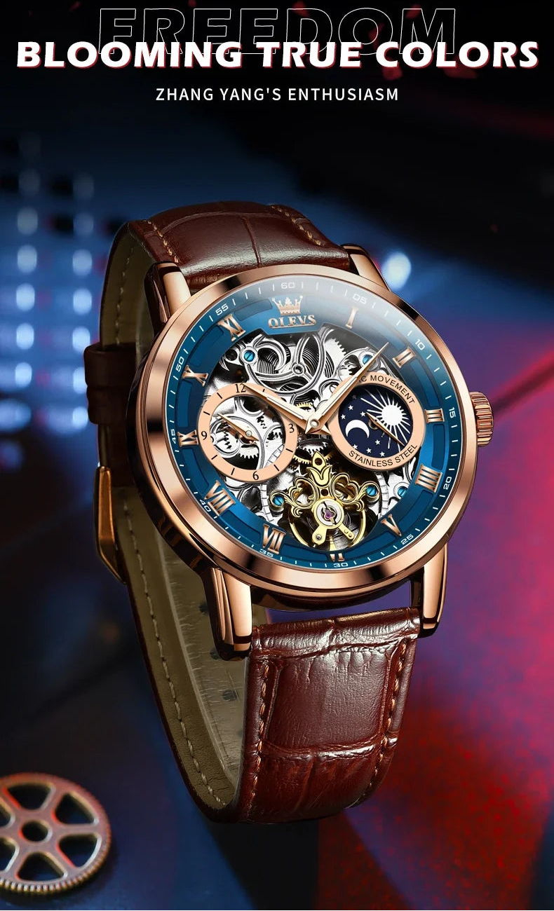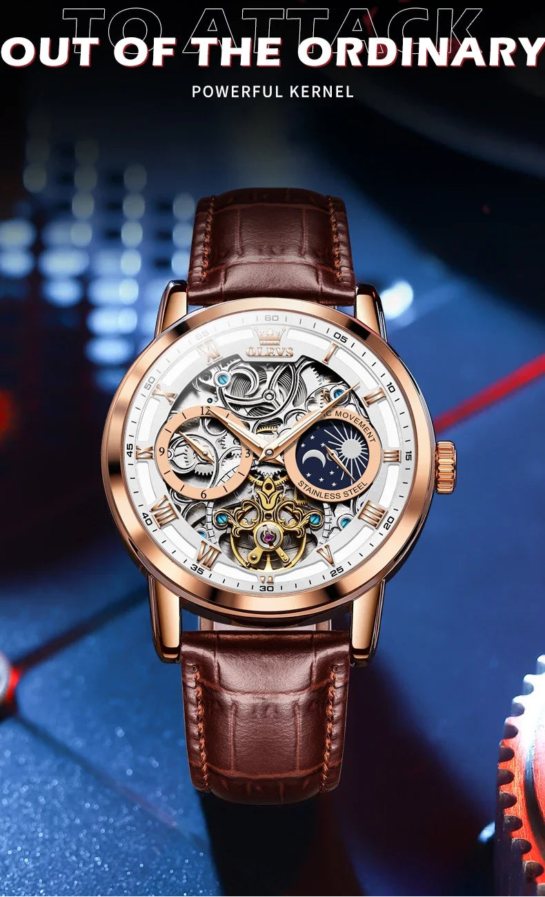 Luxury Mechanical Men’s Watch with Skeleton Design and Moon Phase