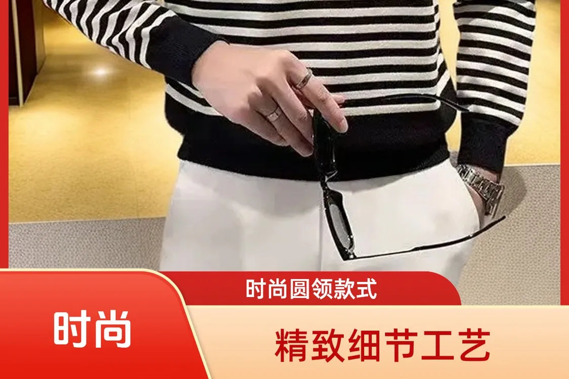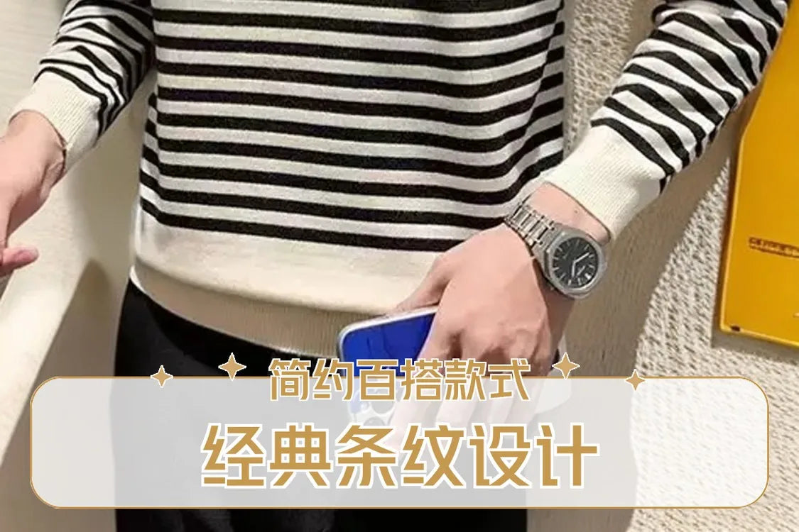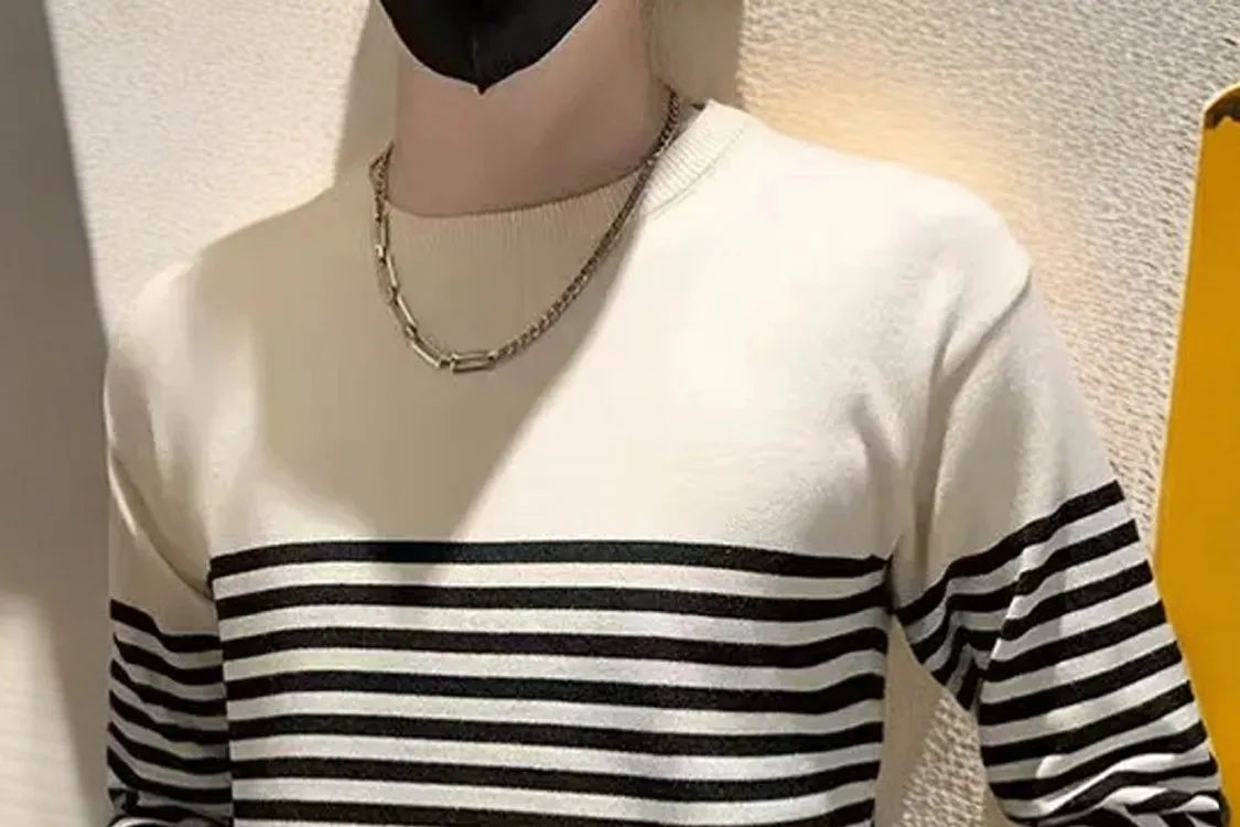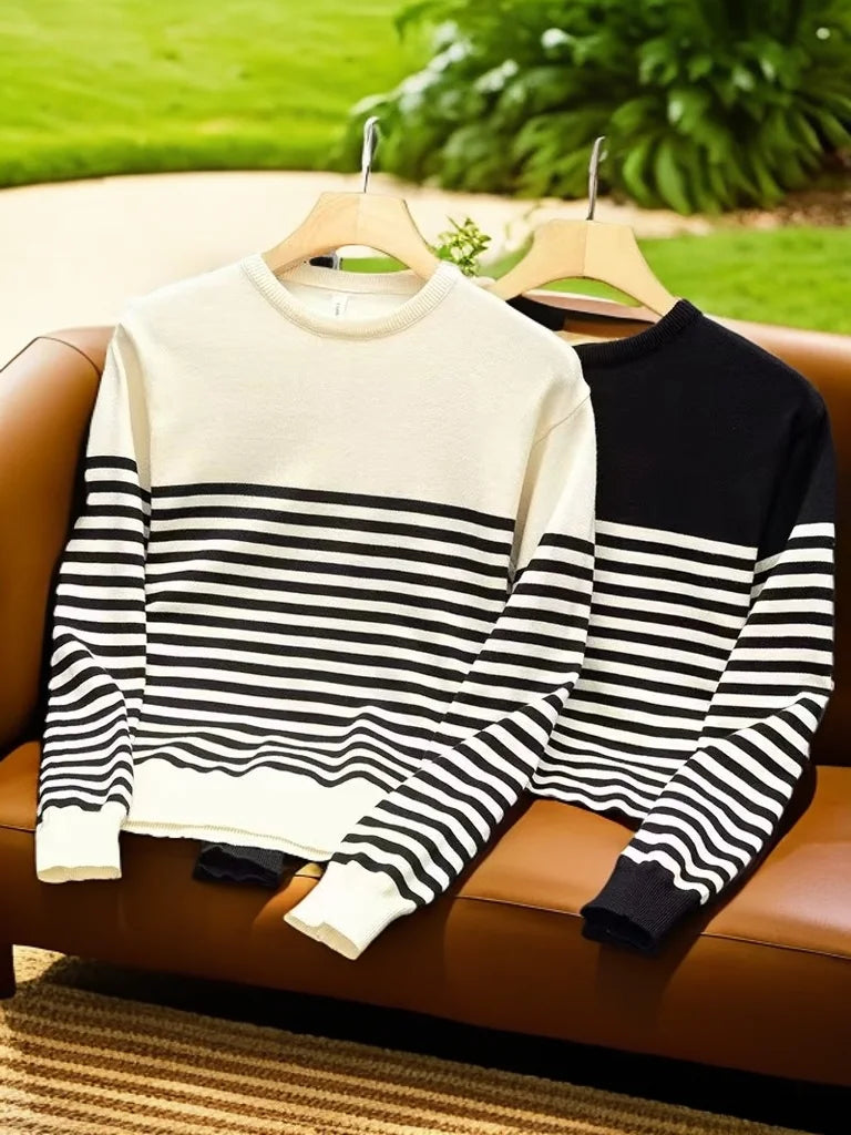 This sweater features bold horizontal stripes placed on the lower half creating a balanced and contemporary visual effect