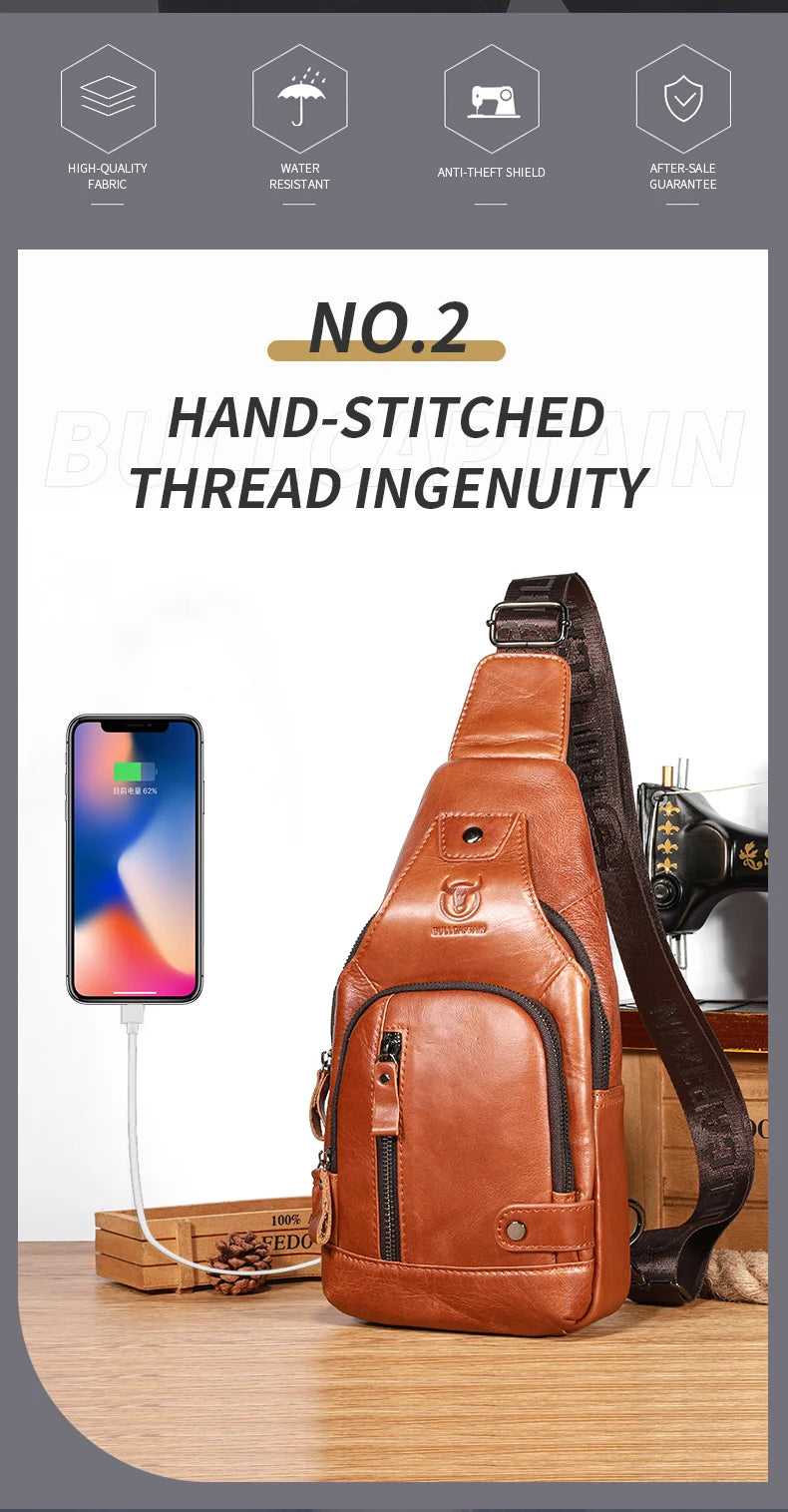 Bullcaptain Men’s Leather Sling Bag – USB Charging Crossbody Chest Pack for Travel, Work & Casual Use